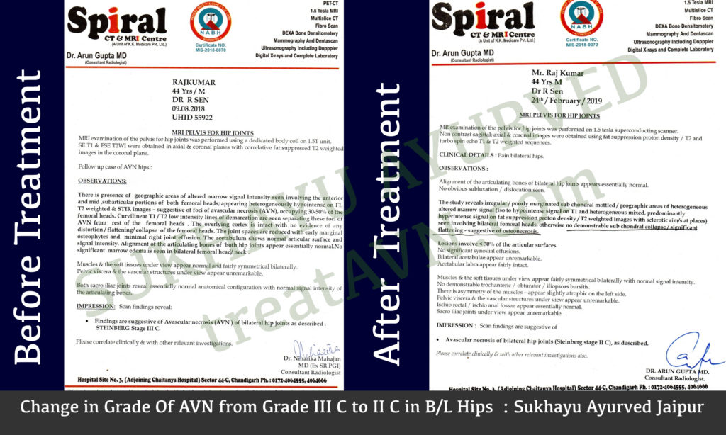 उन्होंने वैद्य प्रदीप और अवास्कुलर नेक्रोसिस के उपचार के बारे में पता किया और हमें संपर्क किया। उनकी रिपोर्ट का अध्ययन किया गया और अंत में वह सितम्बर 2018 के महीने में उपचार के लिए सुखायु आयुर्वेद में शामिल हो गए।